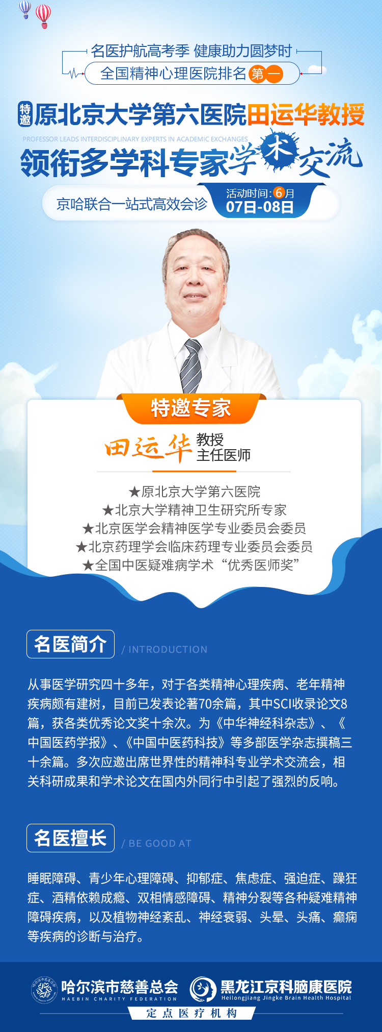 在孩子們經(jīng)歷高考這場身心巨變的關(guān)鍵時刻,6月7日-8日(僅兩天。,我們鄭重邀約原北京大學(xué)第六醫(yī)院精神科權(quán)威專家田運(yùn)華教授親臨本院,開展特別會診活動。
